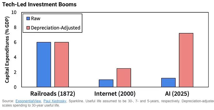 In nominale termen waren de spoorweginvesteringen omvangrijker dan de huidige datacenteruitbouw. Maar als je afschrijvingen mee in rekening brengt, breken de AI-investeringen alle records. Een treinspoor heeft een levensduur van dertig jaar, de chips in datacenters een van drie tot vijf jaar, afhankelijk van wie het zegt. Meta, Microsoft en Google zeggen dat ze hun datacenterchips op vijf jaar afschrijven. Hun voornaamste leverancier, Nvidia, zegt ze die om de drie jaar moeten vervangen.