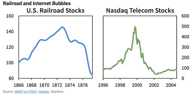 Alleen hebben de spoor- en de telecomboeren weinig plezier beleefd aan hun investeringslust. Die zorgde voor een te groot aanbod voor onvoldoende vraag, waardoor de prijzen voor treinvervoer en internetbandbreedte in elkaar stuikten, samen met de aandelenkoersen van de betrokken bedrijven.