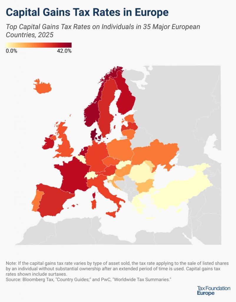 Als je er een hittekaartje van Europa met alle meerwaardebelastingspercentages bijhaalt, dan rijst de vraag: vanwaar de onrust? Met een meerwaardebelasting van 10 procent zou België een lichtoranje stipje zijn, de tint van Bulgarije, omgeven door een zee van donkerder rood. Het Europese gemiddelde is rond 19 procent. Alleen de Tsjechische Republiek, Luxemburg, Slovenië en Slowakije heffen geen belasting op meerwaarden.