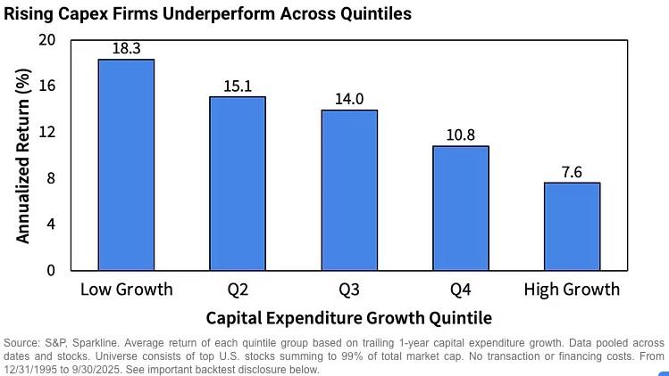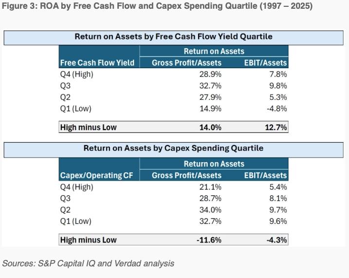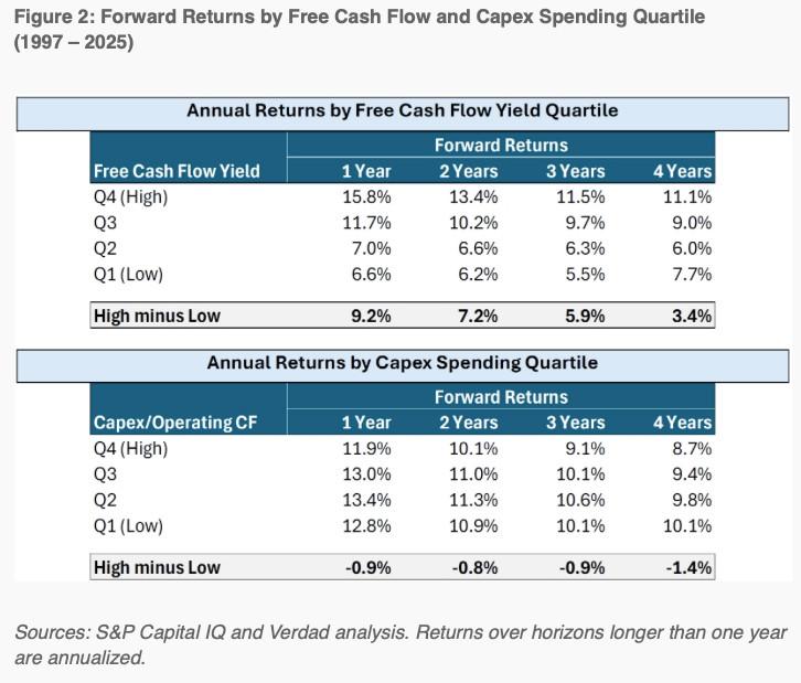 De strategen van de vermogensbeheerder Verdad Capital keken onlangs of de vrije kasstroom en de investeringen enige voorspellende waarde hebben voor toekomstige koersrendementen. Ze groepeerden bedrijven volgens hun kasstroomrendementen (fcf yield) en investeringsintensiteit (capex spending) en keken vervolgens naar de beursrendementen over verschillende tijdspannes.