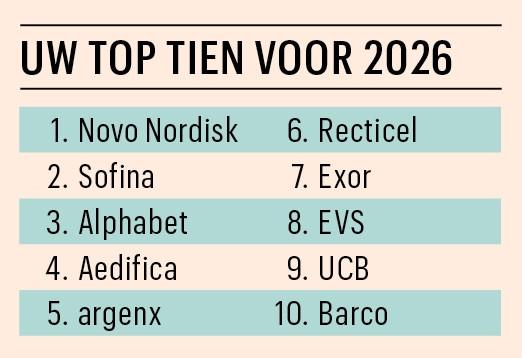 Beïnvloeden we met onze top tien uw favorietenlijst al te zeer? Uw ultieme favoriet, Novo Nordisk zit ook in onze top tien voor 2026. Maar voor het overige valt het nog wel mee, met nog twee identieke waarden: Aedifica en argenx. Voor het overige is het regelmatig wel zo dat uw favorieten ook van ons het advies ‘koopwaardig’ krijgen.