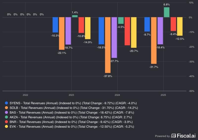De miserie van Syensqo is natuurlijk niet alleen te wijten aan de splitsing, de Europese chemiesector gaat door zwaar weer. Maar zelfs in vergelijking met een aantal grote Europese chemiereuzen komt het er bekaaid vanaf.