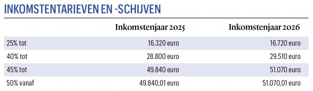 De inkomsten boven de belastingvrije som worden progressief belast. Hoe hoger het bedrag, hoe hoger het belastingpercentage. Het tarief varieert tussen 25 en 50 procent, volgens vastgelegde inkomstenschijven. Ook die schijven worden voor het inkomstenjaar 2026 geïndexeerd. Er zijn voorlopig geen wetsontwerpen die betrekking hebben op deze tarieven en -schijven.