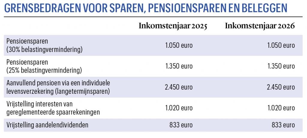Het fiscale plafond voor de vrijstelling van intresten op gereglementeerde spaarrekeningen blijft gelijk aan dat van vorig jaar. Er is dus geen indexering. Dat geldt ook voor de maximale belastingvermindering binnen het federale pensioensparen en het langetermijnsparen (de premie van een individuele levensverzekering plus kapitaalaflossingen). De vrijstelling van aandelendividenden blijft eveneens ongewijzigd.