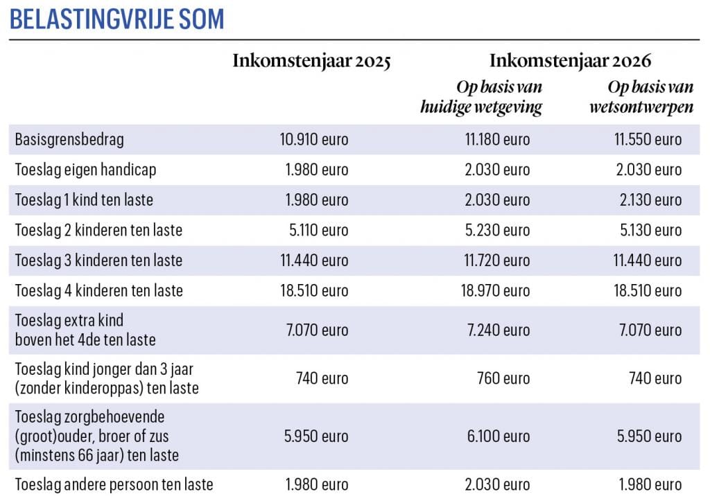 De belastingvrije som is een onbelaste inkomstenschijf waarop iedereen die aan de personenbelasting onderworpen is recht heeft. Enerzijds is er een basisbedrag, anderzijds gelden verhogingen voor wie bijvoorbeeld een handicap heeft of kinderen ten laste heeft. In de tabel vindt u voor het inkomstenjaar 2026 zowel de geïndexeerde bedragen op basis van de huidige wetgeving als de cijfers op basis van de hangende wetsontwerpen. Voor de meeste toeslagen geldt een indexeringsstop.