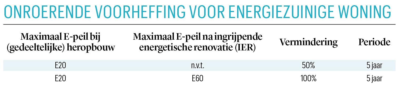Een energiezuinige woning komt in aanmerking voor een reductie gedurende vijf jaar. Het pand dient een voldoende laag E-peil te hebben – dat wordt vermeld in het energieprestatiecertificaat of EPC. De vermindering op de onroerende voorheffing geldt enkel na een ingrijpende energetische renovatie (IER) of bij (gedeeltelijke) herbouw, afhankelijk van het E-peil dat na de ingrepen behaald wordt. De voorwaarden variëren naargelang de aard van de werken.