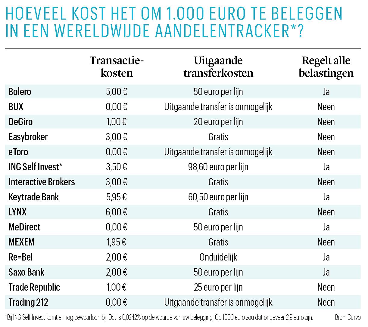 Bovendien trok Keytrade Bank de kosten voor uitgaande transfers op tot 60,5 euro per lijn. “Die transferkosten houden beleggers ook maar beter in de gaten”, waarschuwt Yoran Brondsema, medeoprichter van de app Curvo en mede-auteur van De Hangmatbelegger. “Bovendien biedt niet elke broker de mogelijkheid om je portefeuille over te dragen naar een andere broker. Bij BUX bijvoorbeeld kan dat niet. Met de invoering van de meerwaardebelasting in België betaal je dus niet enkel de kosten om die aandelen te verkopen en opnieuw te kopen, maar je betaalt dan mogelijk ook nog eens 10 procent meerwaardebelasting op de winst die je realiseert.”