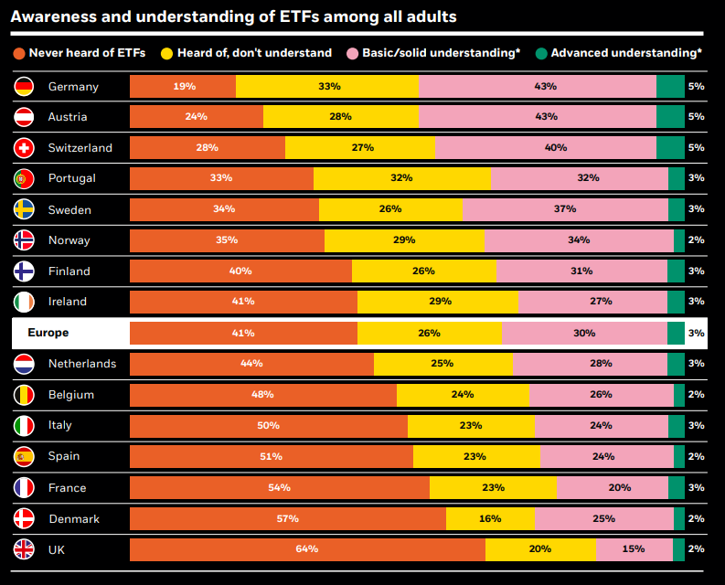 Als u nog niet weet wat een ETF is, dan bent u in goed gezelschap. 48 procent van de Belgen heeft nog nooit van ETF’s gehoord, leert een recente rondvraag van de vermogensbeheerder BlackRock. 24 procent heeft er al van gehoord, maar begrijpt er niks van. 26 procent kent de basis en 2 procent heeft een verregaand begrip (zie illustratie uit People & Money-brochure van BlackRock hier onder).