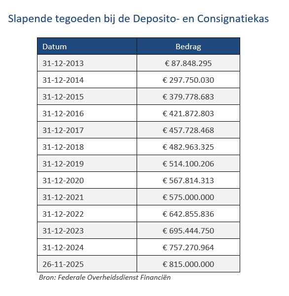 De 815 miljoen euro aan slapende tegoeden bij de Deposito- en Consignatiekas is verdeeld over bijna 675.000 rekeningen en contracten. Dat komt overeen met ongeveer 1.200 euro per dossier. De som groeit jaar na jaar verder aan. Vorig jaar kwam er 62 miljoen euro bij, en ook sinds begin 2025 groeiden de slapende tegoeden al met bijna 58 miljoen euro aan.