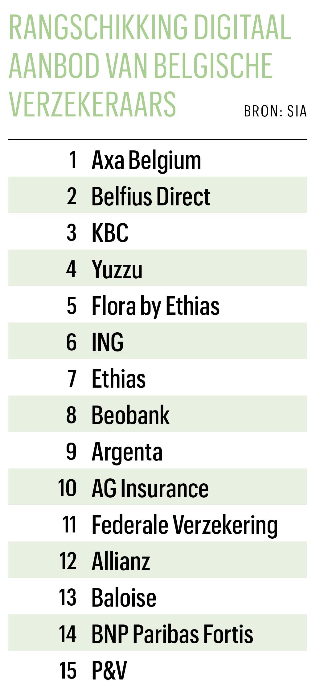 De Belgische rangschikking van beste digitale verzekeraars (zie tabel) wordt dit jaar opnieuw aangevoerd door AXA België. Belfius Direct volgt op de tweede plaats. KBC Verzekeringen wint een plaatsje ten nadele van Yuzzu en komt als nummer drie mee op het podium. Internationaal staan de drie Belgische verzekeringsbedrijven in de top tien. AXA België voert de lijst zelfs aan. Lees verder onder de tabel.
