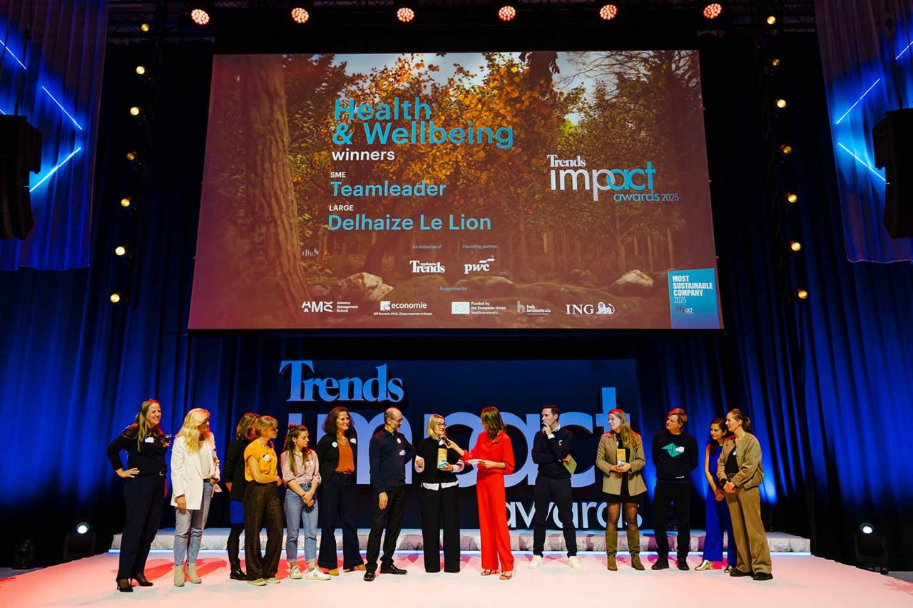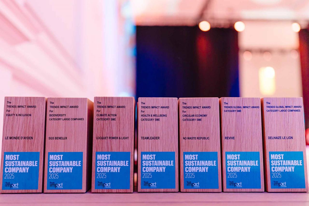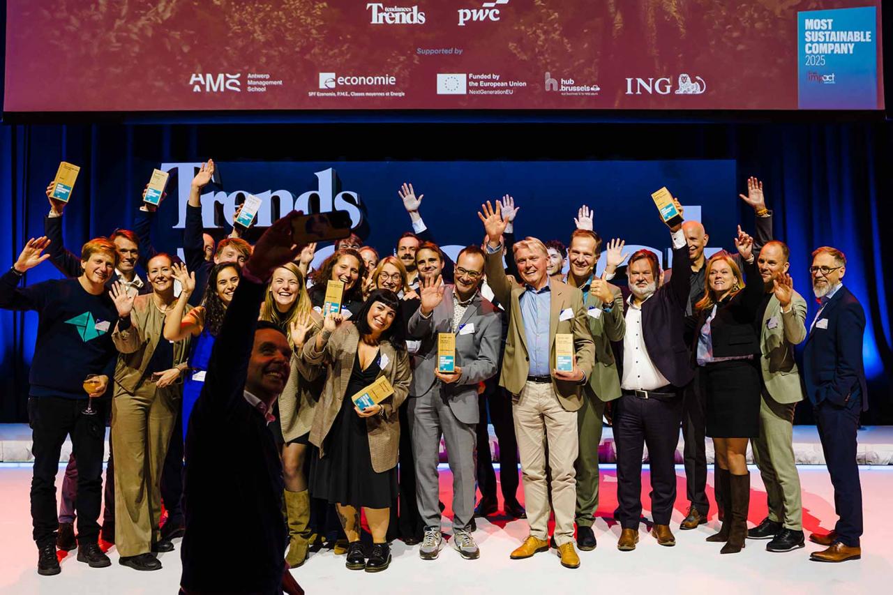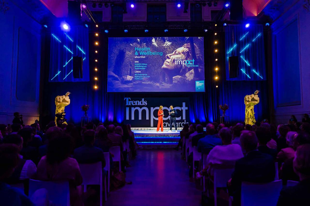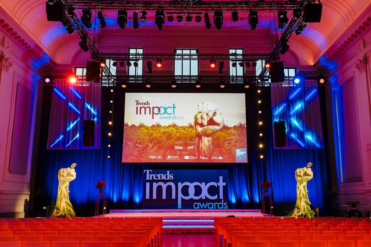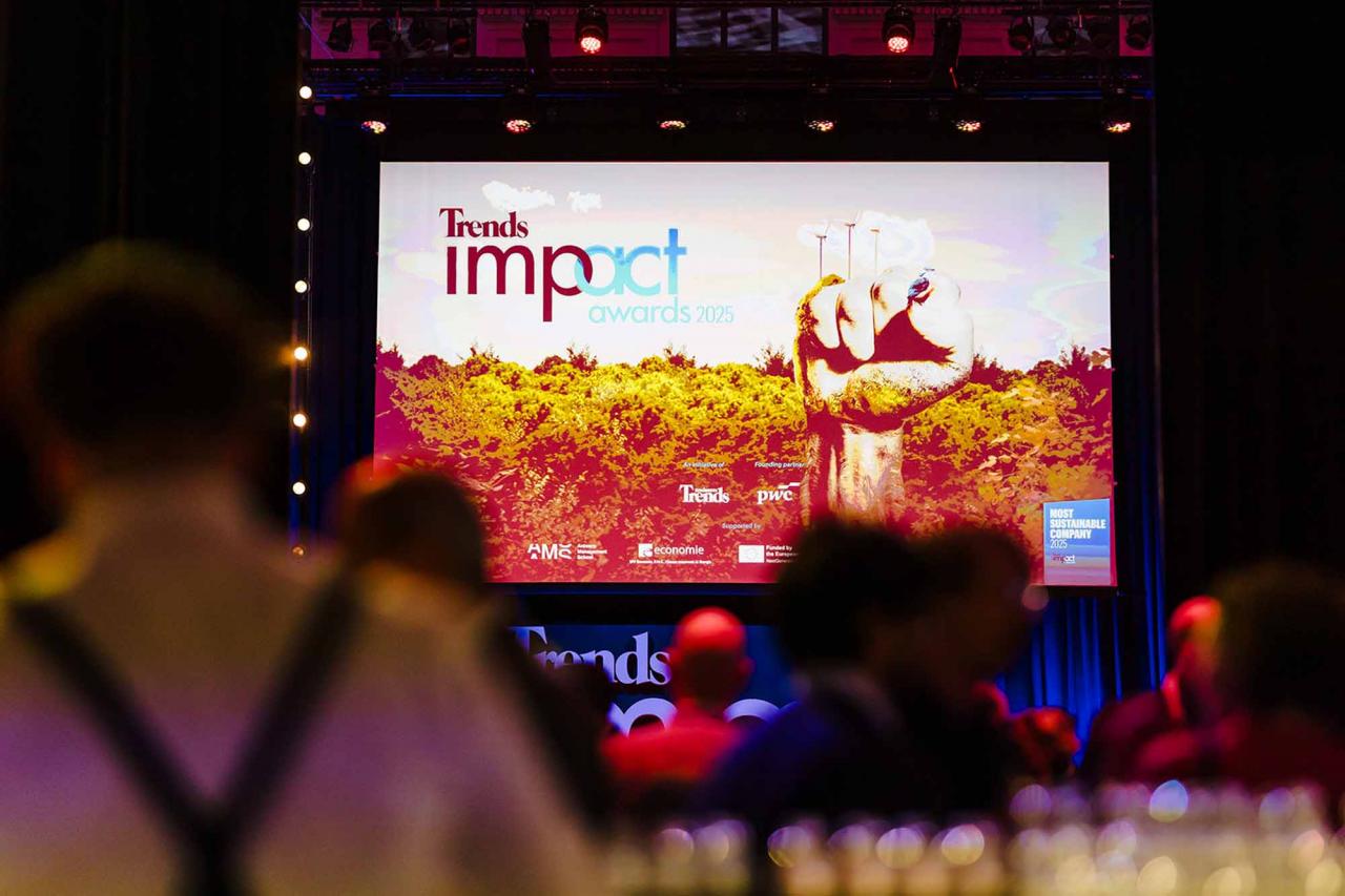 Op een gala-avond in Tour & Taxis in Brussel heeft Trends, in samenwerking met PwC België en Antwerp Management School, donderdagavond zijn Impact Awards voor 2025 uitgereikt aan kmo’s en grote bedrijven die met hun projecten een duurzame impact creëren op hun omgeving. Ontdek hier alle winnaars. Bekijk hieronder een fotoreeks van het event, dat dit jaar werd voorafgegaan door de Trends Impact Corners Break-out Sessions met enkele interessante sprekers. Klik op het vierkantje om de fotoreeks uit te vergroten. Copyright: Leyla Hesna.