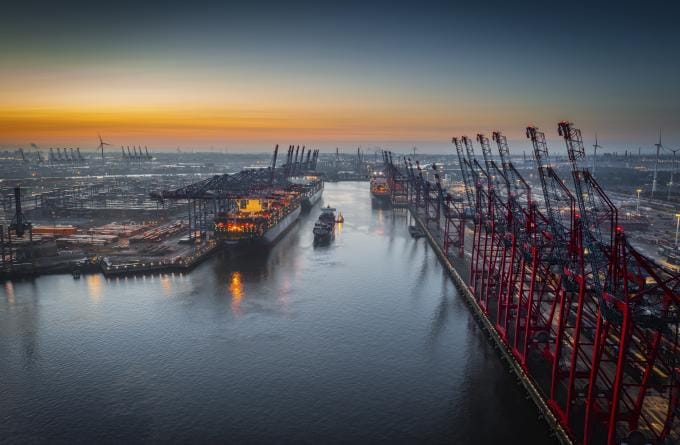 Aerial view of a container terminal with large container cargo ships and gantry cranes. A cargo ship is navigating through the central waterway. On both sides of the waterway are massive container terminals lined with red and black gantry cranes used for loading and unloading ships. on the left docked ships with brightly lit containers. Moody sky at dawn. Port of Hamburg in Germany, Europe.