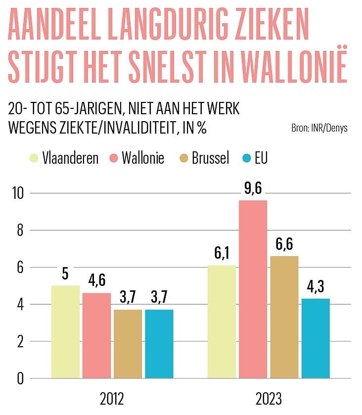 In Wallonië is het aantal langdurig zieken tussen 2012 en 2023 gestegen van 4,6 naar 9,6 procent van de 20- tot 65-jarigen, in Brussel van 3,7 naar 6,6 procent. Vlaanderen mag dan wel de grootste groep langdurig zieken tellen – bijna 270.000, tegenover 198.000 in Wallonië – de toename was er het voorbije decennium veel beperkter: van 5 naar 6,1 procent. Ter vergelijking: op EU-niveau is slechts 4,3 procent van de 20- tot 65-jarigen langdurig ziek. De stijging stoppen of terugdringen vergt dus een communautaire hervorming (zie grafiek Aandeel langdurig zieken stijgt het snelst in Wallonië).