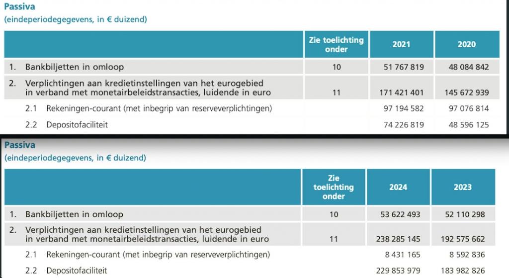 Die cashberg van Euroclear staat dus ook op de balans van de Nationale Bank. In 2021 stond daar onder de depositofaciliteit 74 miljard euro geparkeerd. Eind 2024 was dat bedrag gestegen naar 230 miljard euro. Een groot deel daarvan is geblokkeerd Russisch geld.