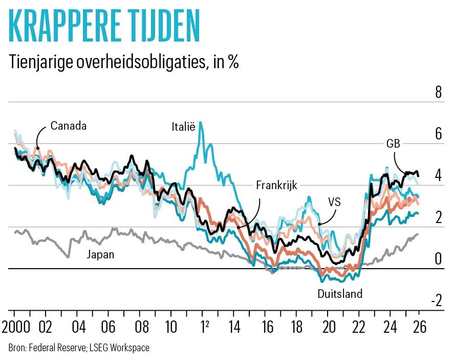Toch is de wereld een financiële puinhoop. In 2026 zal de schuldquote van de geavanceerde economieën meer dan 110 procent van het bbp bedragen. Ondanks de inkomsten uit invoerrechten zal de Amerikaanse regering waarschijnlijk minstens 6 procent van het bbp lenen. Omdat centrale banken de afgelopen jaren de rente hebben verlaagd, hebben de langetermijnrentes, die omgekeerd evenredig zijn aan de prijzen, niet altijd meegewerkt. Zelfs Japan, met zijn lage rente, lijkt niet langer veilig. De dertigjarige rente bereikte onlangs een historisch hoogtepunt.