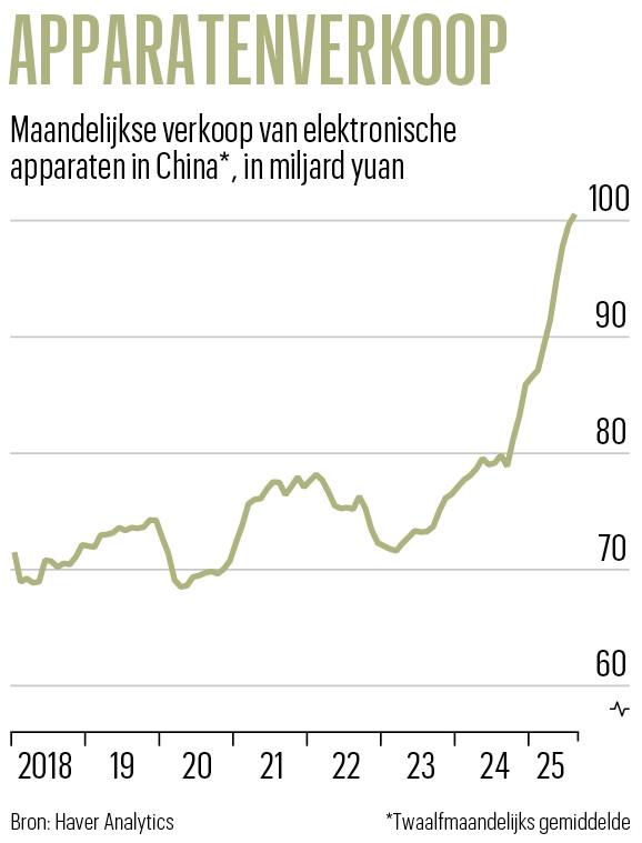 Dat systeem was zo populair dat sommige provincies eerder dan gepland zonder geld kwamen te zitten om de subsidies uit te betalen, waardoor ze moesten wachten op de volgende tranche van de centrale overheid. De verkoop van duurzame consumptiegoederen nam een hoge vlucht. De keerzijde is echter dat veel van die aankopen anders in 2026 zouden hebben plaatsgevonden. Huishoudens die de afgelopen maanden veel geld hebben uitgegeven, zullen het jaar daarna waarschijnlijk geen nieuwe goederen meer aanschaffen. Hoe vaak moet je je toilet vernieuwen? De detailhandelsverkopen in 2026 zouden dus kunnen lijden onder een terugslag en zelfs kunnen dalen tot onder het niveau van vóór de subsidie. Dat gevaar zou de regering kunnen dwingen de regeling met nog een jaar te verlengen. Maar de consumptie zal waarschijnlijk nog altijd langzamer groeien.