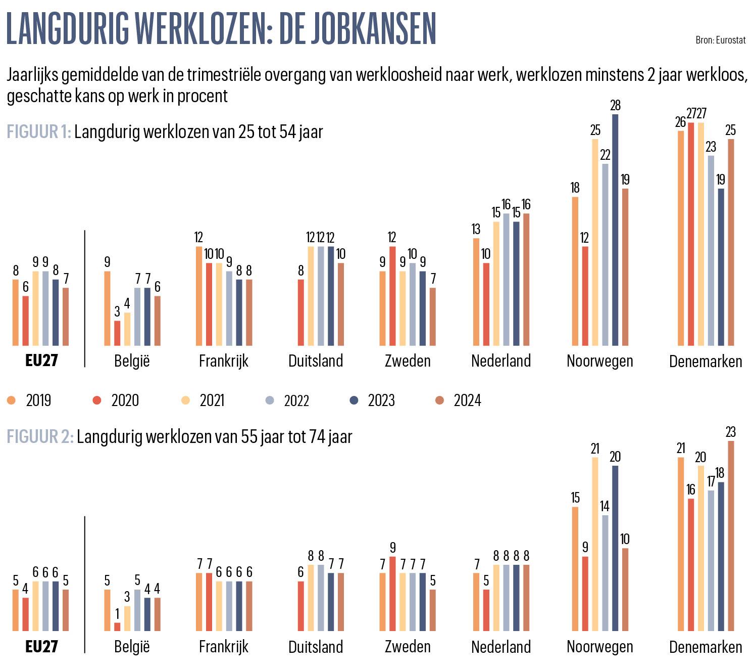 Hoeveel kans maken die vele tienduizenden pechvogels op de arbeidsmarkt? Het ziet er slecht uit. Het Europees statistiekagentschap Eurostat onderzocht de kansen van werkzoekenden die minstens twee jaar werkloos waren om in het volgende kwartaal een baan te bemachtigen. Voor de Belgische 25- tot 54-jarige langdurig werklozen was die kans amper 6 procent in 2024. (zie grafiek Langdurig werklozen: de jobkansen). De voorbije jaren bleef ons land systematisch onder het Europese gemiddelde, met uitzondering van 2019. Andere EU-landen, en dan vooral Nederland, Noorwegen en Denemarken, doen het beter dan België.