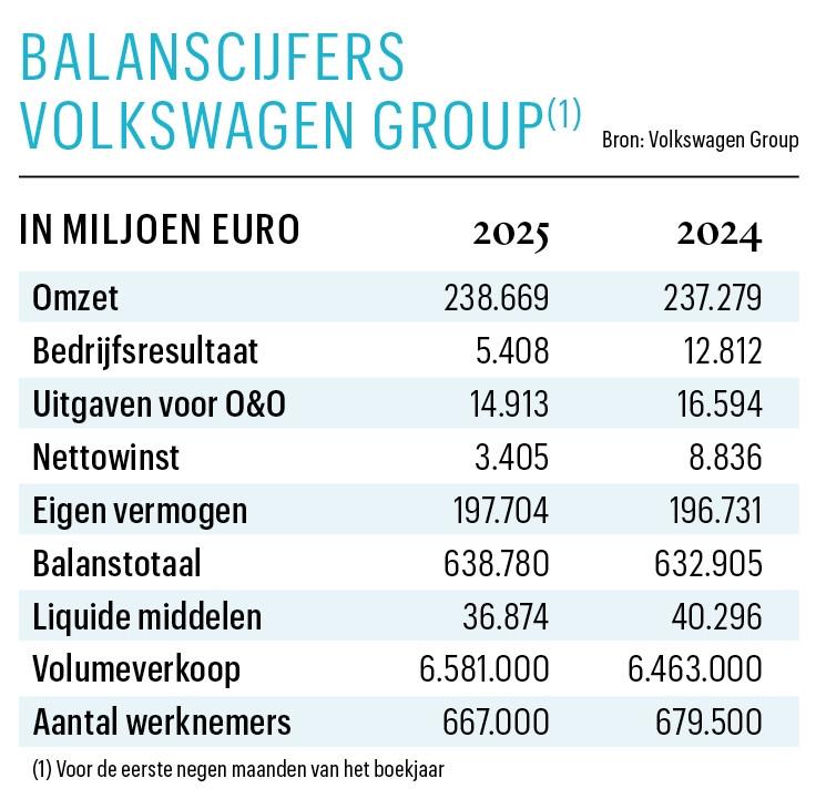 Met dat alles stelt Volkswagen zijn vooruitzichten voor het hele jaar bij. De omzet en de volumes zouden naar verwachting stabiel blijven. Maar de bedrijfswinstmarge zou zakken naar 2 tot 3 procent, in vergelijking met bijna 6 procent in 2024.