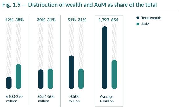 De gemiddelde totale vermogenswaarde van de deelnemende familiekantoren bedraagt 1,4 miljard euro. Dat is rekening houdend met de operationele bedrijven, die voor veel vermogende families een groot deel van het familiefortuin uitmaakt. Wanneer de waarde van operationele familiebedrijven wordt uitgesloten, bedragen de gemiddelde activa onder beheer (AuM) – het geld dat daadwerkelijk wordt beheerd – gemiddeld 654 miljoen euro.