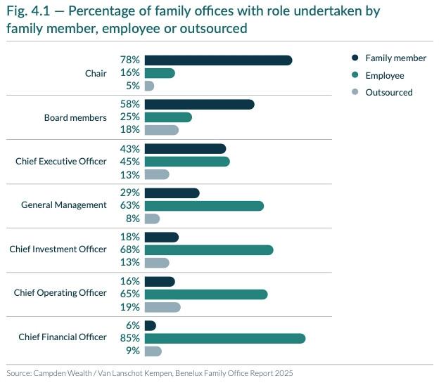 Zo voeren externe professionals vaker uitvoerende functies uit. Meer dan de helft van de kantoren heeft bijvoorbeeld een CEO die geen familielid is. Functies zoals chief investment officer (CIO) en chief financial officer (CFO) worden voornamelijk door werknemers of externen vervuld, omdat hiervoor specifieke externe kwalificaties of ervaring vereist zijn, klinkt het. Bestuursfuncties worden dan weer vooral door familieleden ingevuld.