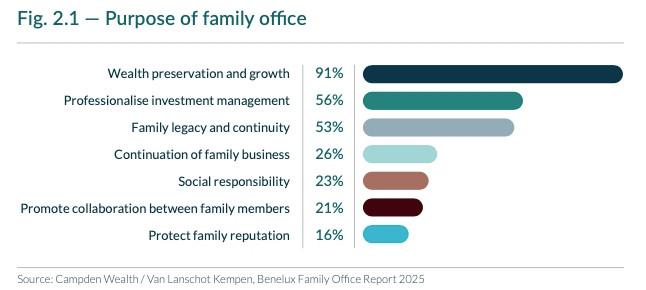 Het rapport geeft ook een inkijkje in het denken en de prioriteiten van de vermogende families. Bovenaan de doelstellingenlijst staat het behoud en de groei van het familievermogen. Voor 91 procent is dat het belangrijkste, gevolgd door de professionalisering van het beleggingsbeheer. Daarna volgen erfeniszaken en continuïteit.