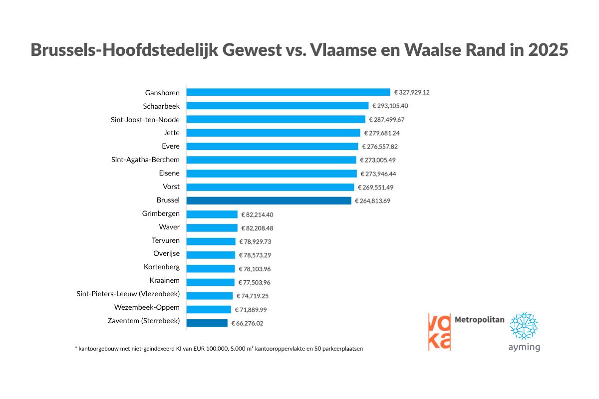 De fiscale kloof tussen Brussel en Vlaams-Brabant is zo groot dat verhuizen over de gewestgrens meteen loont. Zaventem is volgens Konings “drie tot vier keer goedkoper dan bijvoorbeeld Schaarbeek of Sint-Joost”. Ayming becijfert de jaarlijkse belastingfactuur van een gemiddeld kantoorgebouw in Brussel-Stad op 264.000 euro. In Zaventem is dat 66.000 euro. “Als je dat jaar na jaar optelt, spreek je over bedragen die overeenkomen met meerdere voltijdse banen.”