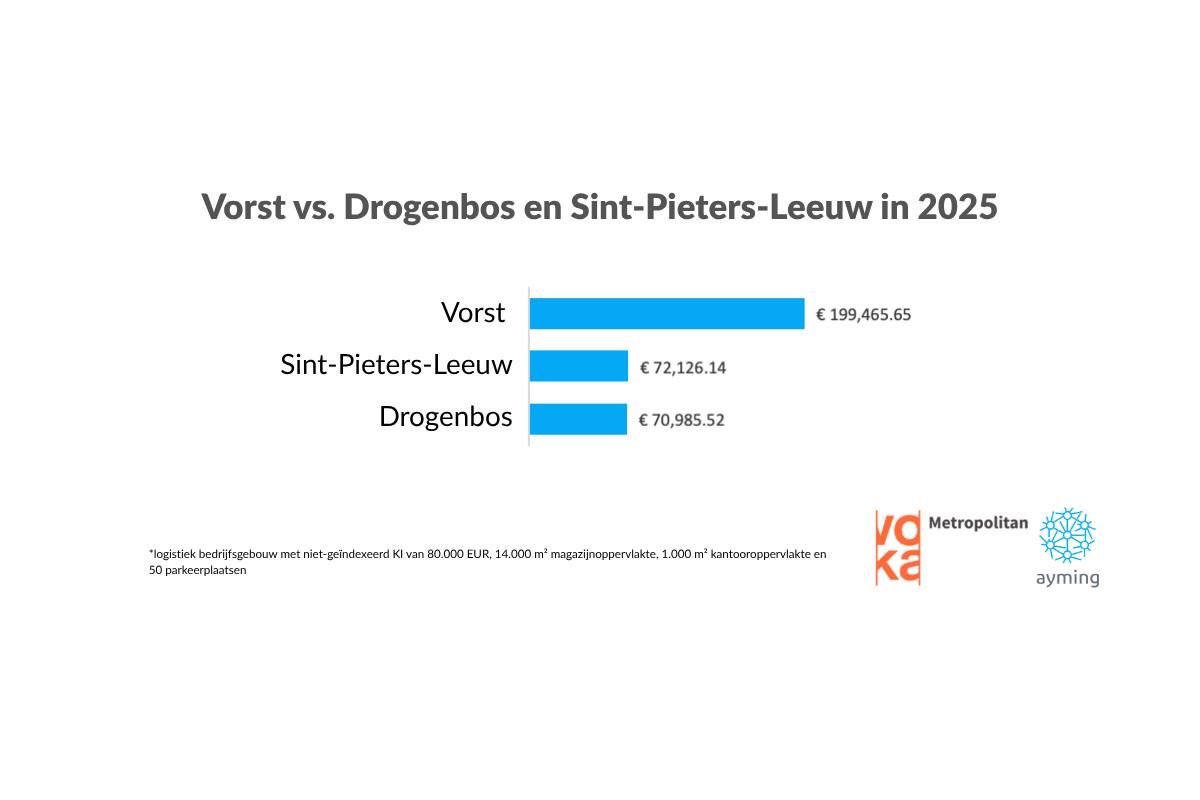 Behalve op kantoren focust de studie van Ayming ook op industriële en logistieke sites, met Audi Vorst als referentiepunt. Voor een standaardconfiguratie van 14.000 vierkante meter magazijnruimte en 1.000 vierkante meter kantooroppervlakte loopt de jaarlijkse belasting in Vorst op tot bijna 200.000 euro. Net over de grens, in Drogenbos en Sint-Pieters-Leeuw, zakt die factuur tot ongeveer 70.000 euro. Volgens Konings is dat verschil onhoudbaar: “Als investeerders die facturen zien, wijken ze uit naar andere sites. Ik vrees dat die locatie nog lange tijd als industriële braakgrond zal worden ingekleurd.” Nabijgelegen alternatieven zijn immers goedkoper én onmiddellijk beschikbaar.