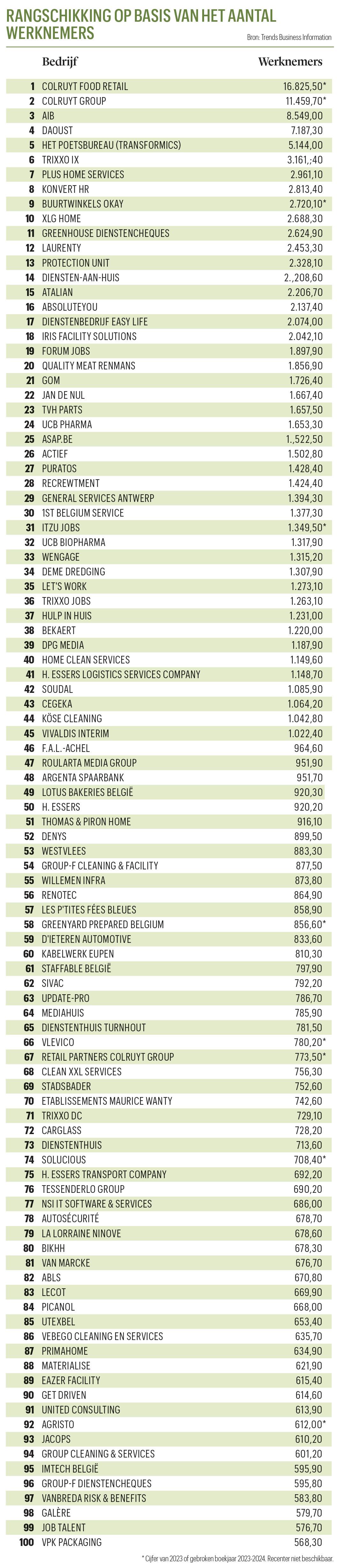 Bij het afsluiten van dit dossier hadden de verschillende vennootschappen van de Colruyt Group, die een gebroken boekjaar hanteert van 1 april tot en met 31 maart, hun jaarrekeningen nog niet neergelegd. Daarom publiceren we in dit dossier de cijfers van het voorgaande boekjaar 2023-2024 voor Colruyt Group. Over de koppositie van de vennootschap Colruyt Food Retail bestaat echter geen twijfel.