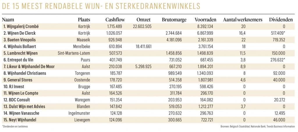 De alcoholconsumptie daalt merkelijk, en toch boeren verschillende wijn- en sterkedrankhandelaars nog altijd goed. Een ruim aanbod, een uitgebreide sectorkennis en een uitstekende dienstverlening verklaren de winsten. Aan de vooravond van de eindejaarsfeesten ging Trends op zoek naar de meest rendabele wijn- en sterkedrankwinkels in Vlaanderen.