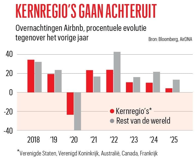 Daarom is het bedrijf op zoek naar nieuwe groeimogelijkheden. Het wil zijn actieterrein voor accommodaties uitbreiden. Zijn vijf kernmarkten (Amerika, Australië, Groot-Brittannië, Canada en Frankrijk) vertegenwoordigen volgens de dataleverancier AirDNA ongeveer de helft van de via het platform geboekte overnachtingen. Airbnb heeft het aantal boekingen in Brazilië gestimuleerd door te investeren in lokale marketing en door betalingsopties toe te voegen. Het probeert nu iets soortgelijks in andere landen, waaronder India, waar het toerisme een hoge vlucht neemt. AirDNA schat dat het aantal geboekte overnachtingen op het platform in de minder gevestigde markten meer dan drie keer zo snel groeit als in de vijf kernlanden (zie grafiek Kernregio’s gaan achteruit).Airbnb begeeft zich ook op het terrein van de hotelboekingen. Ellie Mertz, de financieel directeur van Airbnb, schat dat Amerikanen voor slechts een op de tien overnachtingen buitenshuis een beroep doen op Airbnb. Door hotels toe te voegen, hoopt het platform zakenreizigers aan te trekken. Hotels waarderen Airbnb omdat het, in tegenstelling tot andere boekingssites, niet veel geld uitgeeft aan Google-advertenties, waardoor hun eigen websites lager in de lijst met zoekresultaten staan.
