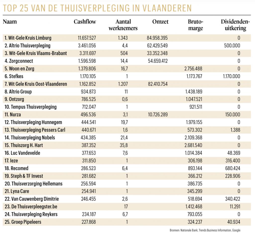 Onze top 25 bevat nog meer ondernemingen waarin zelfstandige thuisverplegers samenwerken, naast ondernemingen die groepen van zelfstandige thuisverplegers bundelen en voor hen allerlei zaken regelen. Zo noemt het nummer vier, Zorgconnect, zich een “beroepsvereniging voor de sector”. De vzw in Temse groepeert meer dan 700 zelfstandige zorgverleners in Vlaanderen. De onderneming doet aan ondersteuning, organiseert opleidingen, en regelt de administratie en de tarievenbehandeling. Ook de bv Ontzorg uit Antwerpen, het nummer negen, is een platform dat zorgverleners ondersteunt en ontzorgt. Die dienstverlening is voor beide bedrijven een rendabele business.