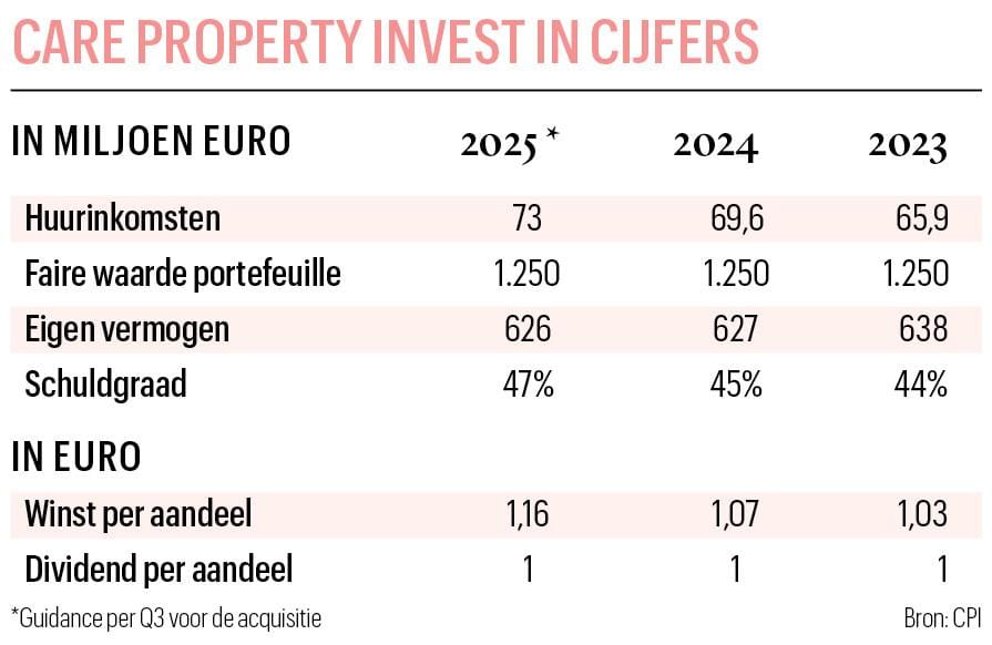 Care Property Invest maakte begin december een stevig statement door negen panden van de zorguitbater Korian en Konrad Invest over te nemen voor 143 miljoen euro. Door die deal stijgt de portefeuille van de beursgenoteerde vastgoedvennootschap met 12 procent, tot 1,4 miljard euro. Om de deal te financieren, haalt het bedrijf 55,5 miljoen euro vers kapitaal op tegen 10,5 euro per aandeel. De huurinkomsten stijgen met 8,2 miljoen euro op jaarbasis.
