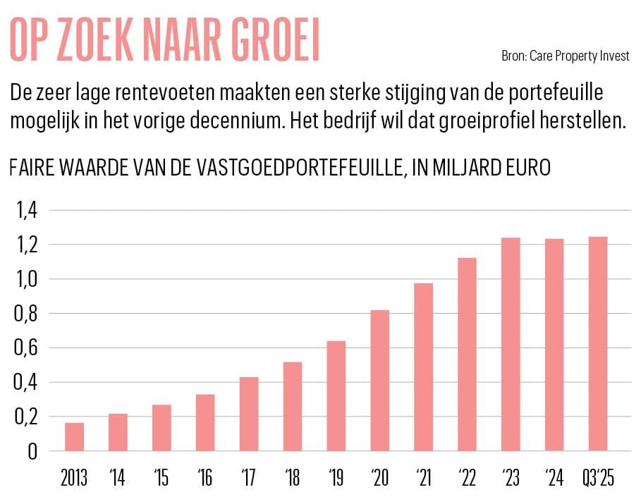 De rugwind van de heel lage rentevoeten blies ook Care Property Invest vooruit in het vorige decennium. “We waren op weg naar een portefeuille van 2 miljard euro en noteerden, net als andere vastgoedspelers, met een stevige premie ten opzichte van de intrinsieke waarde. De coronacrisis en de stijging van de rentevoeten hebben dat elan gebroken. Onze groei is sinds 2022 stilgevallen (zie grafiek, nvdr). Op de beurs noteren we met een korting van 35 procent op onze intrinsieke waarde van ongeveer 18 euro per aandeel. De premie was destijds overdreven, maar de huidige korting is ook een aberratie. Nu ja, de markt heeft altijd gelijk. En we sturen geen beurskoers aan, we runnen een bedrijf”, zegt Patrick Couttenier.