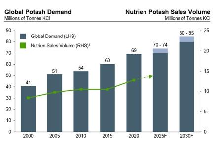 De wereldwijde vraag wordt verwacht toe te nemen van 74 miljoen ton in 2025 naar 84 miljoen ton in 2030 (zie grafiek), gedreven door de stijgende wereldbevolking, die meer voedsel vereist. Met minder beschikbare landbouwgrond per capita moet de productiviteit per hectare toenemen, en kalium is essentieel voor betere oogstopbrengsten, sterkere planten en weerstand tegen droogte en ziekten. Daarenboven waren er wereldwijd recordoogsten in 2024 en 2025, wat tot extra verwijdering van kalium uit de grond leidde en een bijkomende nood aan kalium zeker maakt voor de volgende jaren.