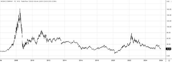 Onderstaande grafiek toont de cycliciteit in de beurskoers van Mosaic, één van de belangrijkste kaliumproducenten ter wereld (ook van fosfaat). Gegeven de sterke fundamenten en goedkope waardering, lijkt Mosaic, net als andere kaliumproducenten, koopwaardig voor de lange termijn.