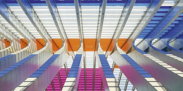 Style Style Kleuren die uit de lucht vallen Architect Santiago Calatrava meets kunstenaar Daniel Buren. Een jaar lang krijgt het station Liège-Guillemins een artistieke toegevoegde waarde: 'Comme tombées du ciel, les couleurs in situ et en mouvement'. De officiële inhuldiging is op 15 oktober, maar Trends Style licht al een tip van de sluier op.